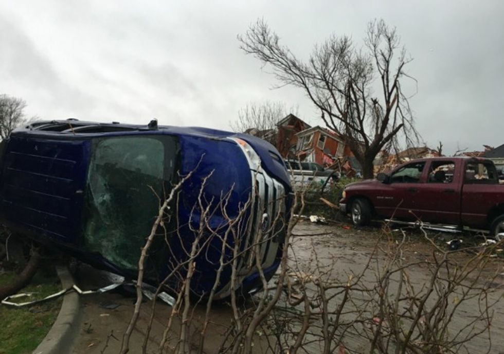 The weather service said an EF-4 tornado, which is the second-most powerful with winds up to more than 200 mph, hit the community at about 6:45 p.m. Saturday. It was near the intersection of Interstate 30 and George Bush Turnpike, which is a major route in the region. At least three people who died were found in vehicles, said Barineau, who also noted that some cars appeared to be thrown from the interstate, though it wasn't known whether that was how the people found in the vehicles died.