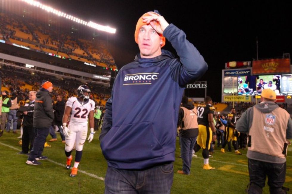 Denver Broncos quarterback Peyton Manning (18) watches from the sideline as his team is losing to the Denver Broncos in the fourth quarter of an NFL football game in Pittsburgh, Sunday, Dec. 20, 2015. (AP Photo/Don Wright)
