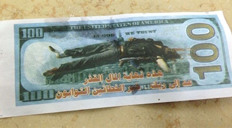 The back side of the bill had a photo of a slain militant and this Arabic warning which Nana reported read: "This is the end to filthy money. Return to Allah, because the good sinners are those who seek forgiveness in the end.”