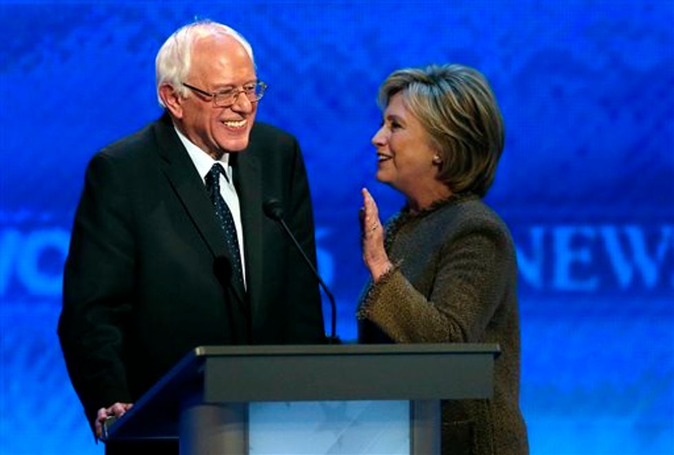 Bernie Sanders and Hillary Clinton interact at the Democratic presidential primary debate Dec. 19 in Manchester, N.H. (AP/Jim Cole)