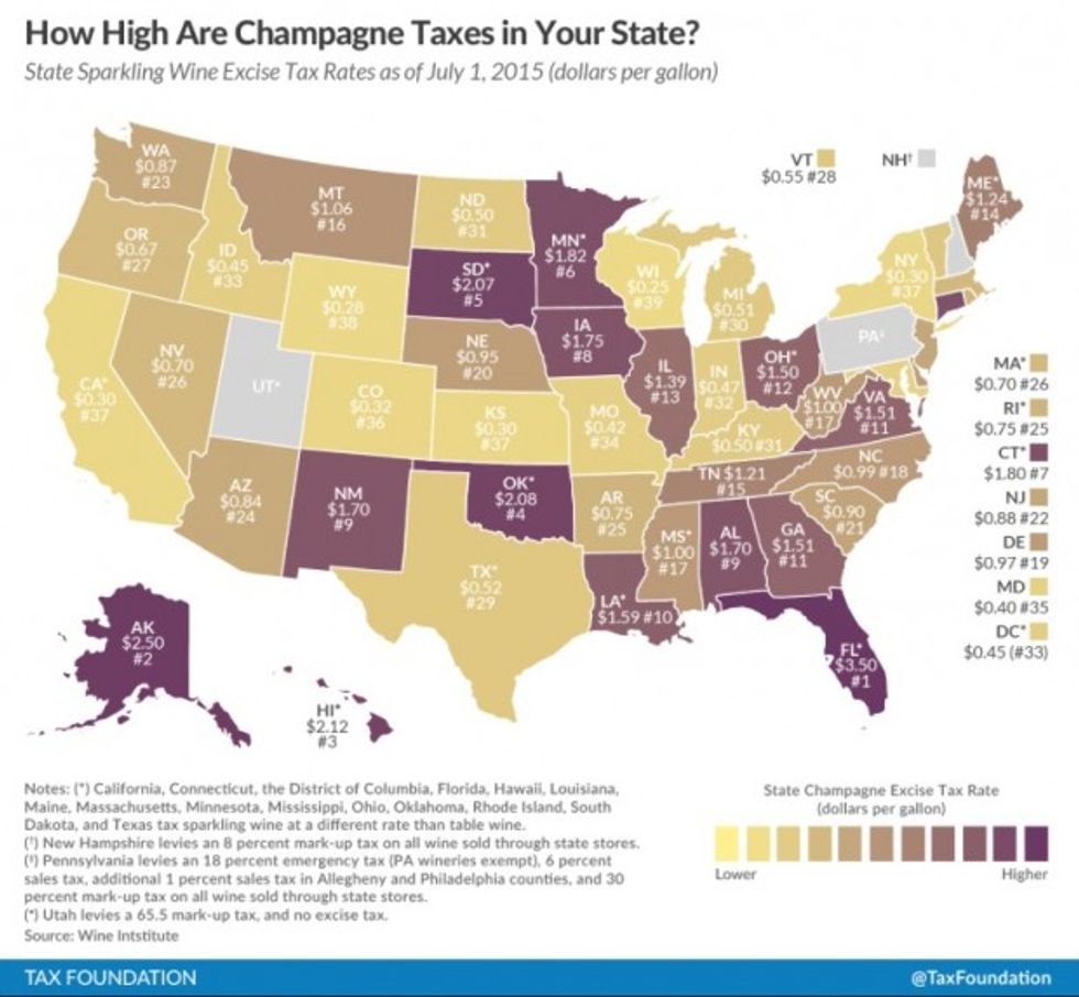 The Tax Foundation, a nonpartisan, nonprofit research organization that examines tax policy at the federal, state and local levels, used data from the Wine Institute to calculate the tax per-gallon on sparkling wine.