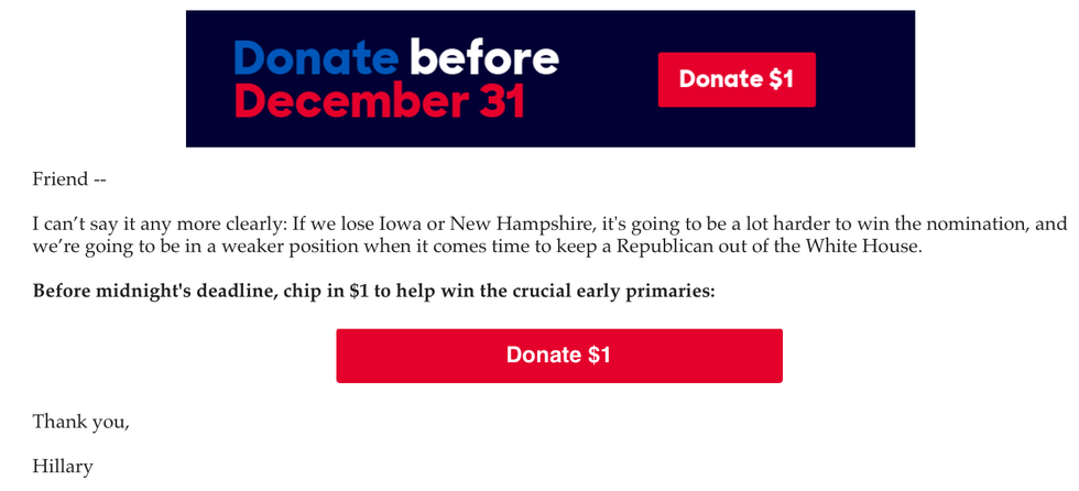 The campaign of Democratic presidential candidate Hillary Clinton sent an email to supporters New Year's Eve with a message directly from Clinton. In the subject line was a warning for potential donors: “If we lose….”
