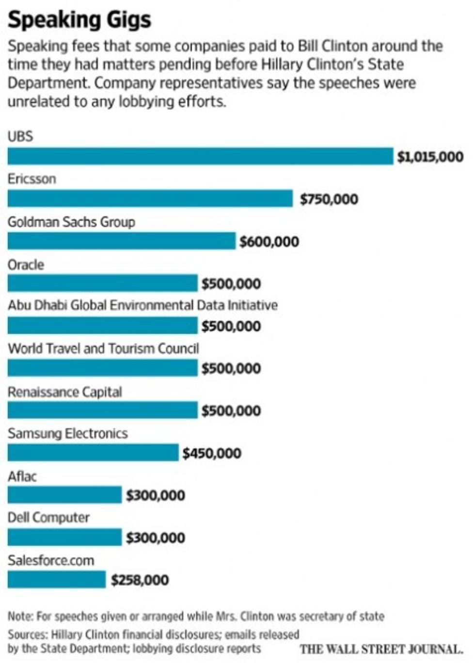 Clinton campaign spokesman Brian Fallon told the Journal that “no evidence exists” that Hillary Clinton’s actions at the State Department were linked to organizations sponsoring Bill Clinton’s speeches, and that all of her decisions were “in line with Obama administration policies and priorities.”