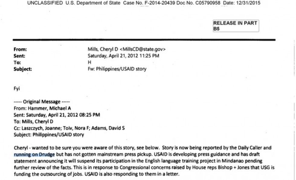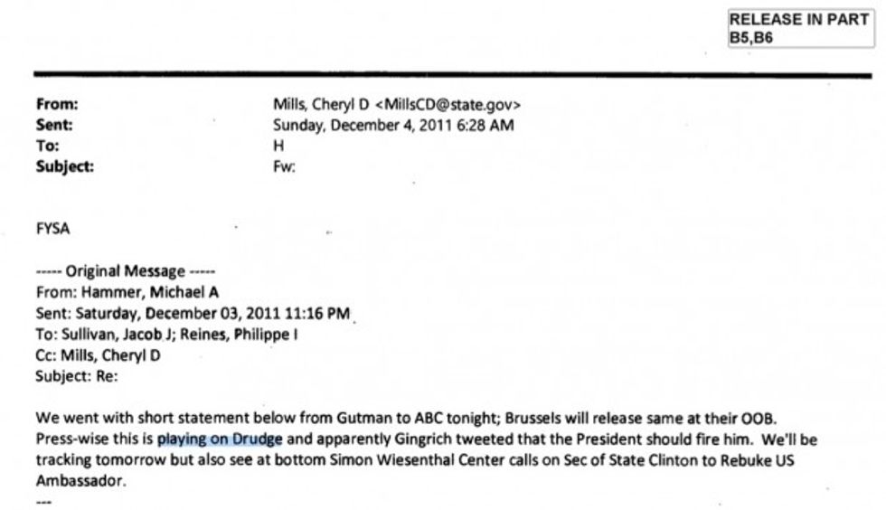 In an April 2012 email, then-Assistant Secretary of State for Public Affairs Michael Hammer alerted then-Chief of Staff to Hillary Clinton Cheryl Mills about a story "running on Drudge."