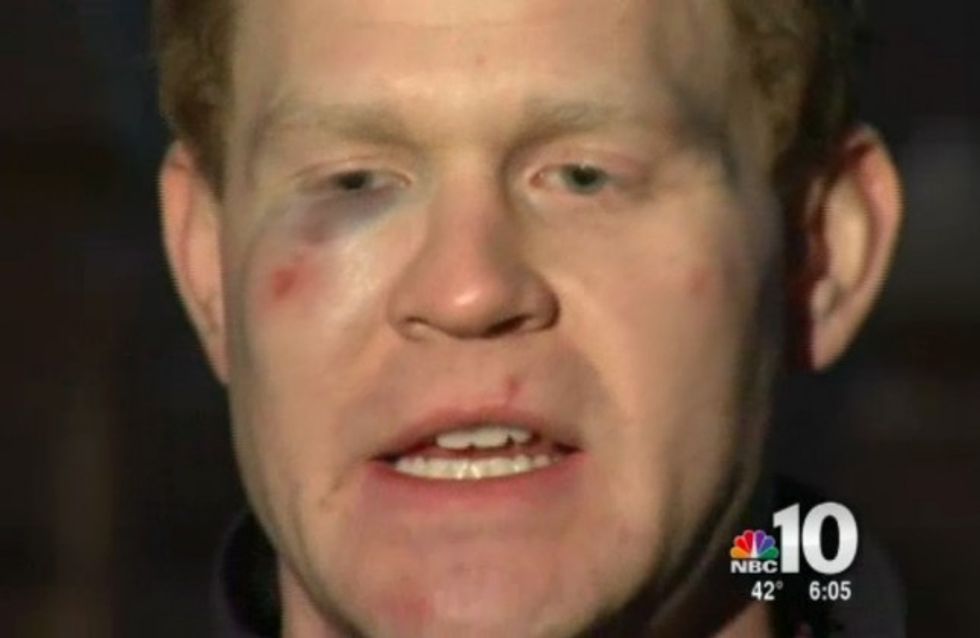 John Holtz, 28, told reporters he was walking his parents' dog with friends when a group of Mummers approached him Friday. He said one called him a gay slur before another punched him in the eye.
