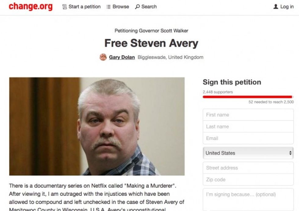 "I am outraged with the injustices which have been allowed to compound and left unchecked in the case of Steven Avery of Manitowoc County in Wisconsin, U.S.A.," reads a Change.org petition created by a U.K. man named Gary Dolan. "Avery's unconstitutional mistreatment at the hands of corrupt local law enforcement is completely unacceptable and is an abomination of due process."