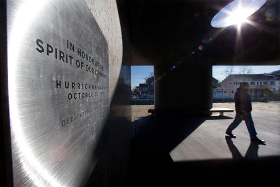A dedication plaque on the structure reads, "In honor of the spirit of our community. Hurricane Sandy, October 29, 2012."