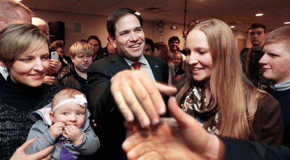 Sen. Marco Rubio, R-Fla. shakes hands during a town hall in New Hampshire on Friday. (AP/Jim Cole)