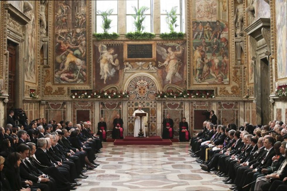 Pope Francis addressed a distinguished group of global leaders Monday at the annual gathering of the Diplomatic Corps, held at the Sala Reggia in the Vatican.