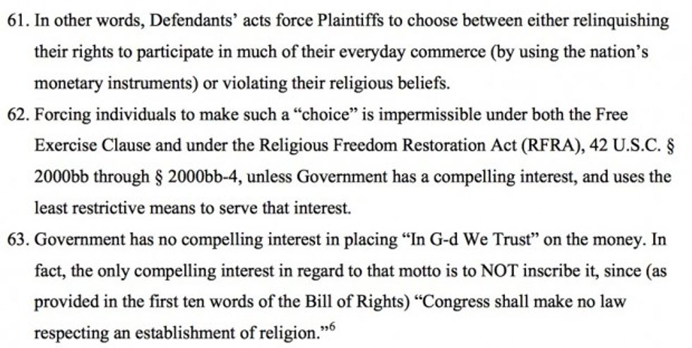 "The 'In G-d We Trust' phrase has continued to be a tool used to perpetuate favoritism for (Christian) Monotheism," the document reads. "It has also continued to perpetuate anti-Atheistic bias."