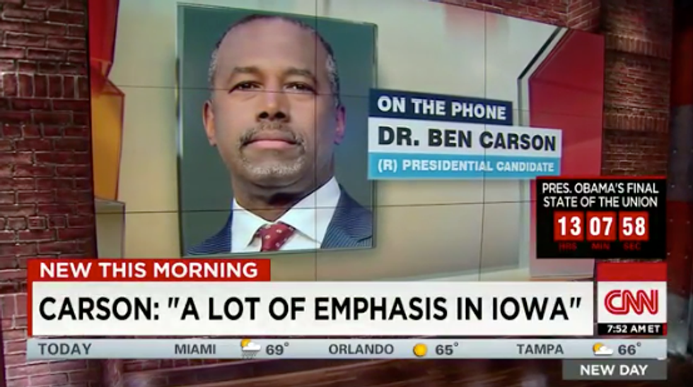 "I thought it was very important to release this now," Carson told Camerota, "because at the State of the Union address tonight, we're going to be given a very rosy picture of what's going on, and the fact of the matter is, America is now at great risk."