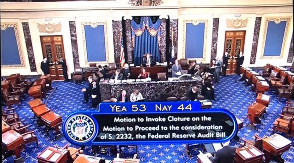 The 53-44 vote fell short of the threshold to overcome a Democratic filibuster. But the Kentucky Republican, who is seeking the GOP's nomination for president, was joined by Democratic Sen. Bernie Sanders, a White House hopeful who occupies the opposite end of the political spectrum from Paul.