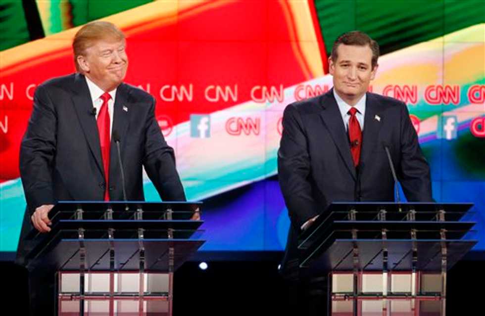 Donald Trump, left, and Ted Cruz react during a debate in December in Las Vegas. (AP/John Locher)