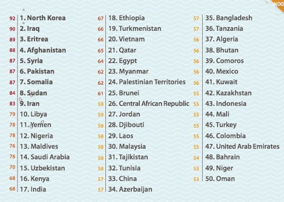 The report found that the 10 worst nations are as follows (listed from most dangerous to least): North Korea, Iraq, Eritrea, Afghanistan, Syria, Pakistan, Somalia, Sudan, Iran and Libya. See the complete list of 50 below: