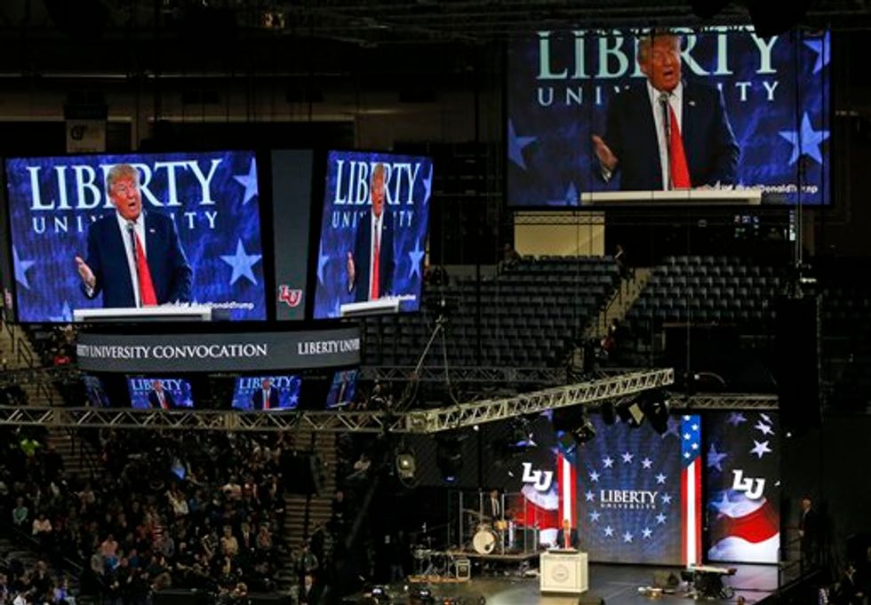 Liberty University president Jerry Falwell, Jr. gave Trump a glowing introduction — calling the business mogul a "visionary" who exemplifies Christ through generosity with his personal wealth and "servant leadership" toward his campaign staff. Falwell clarified that no invitation to speak at the school is an endorsement, but he praised the candidate for not being able to be bought.