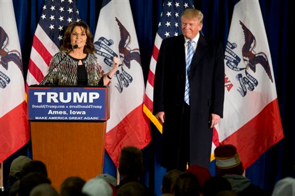 Former Alaska Gov. Sarah Palin, left, endorses Republican presidential candidate Donald Trump Tuesday in Ames, Iowa. (AP/Mary Altaffer)