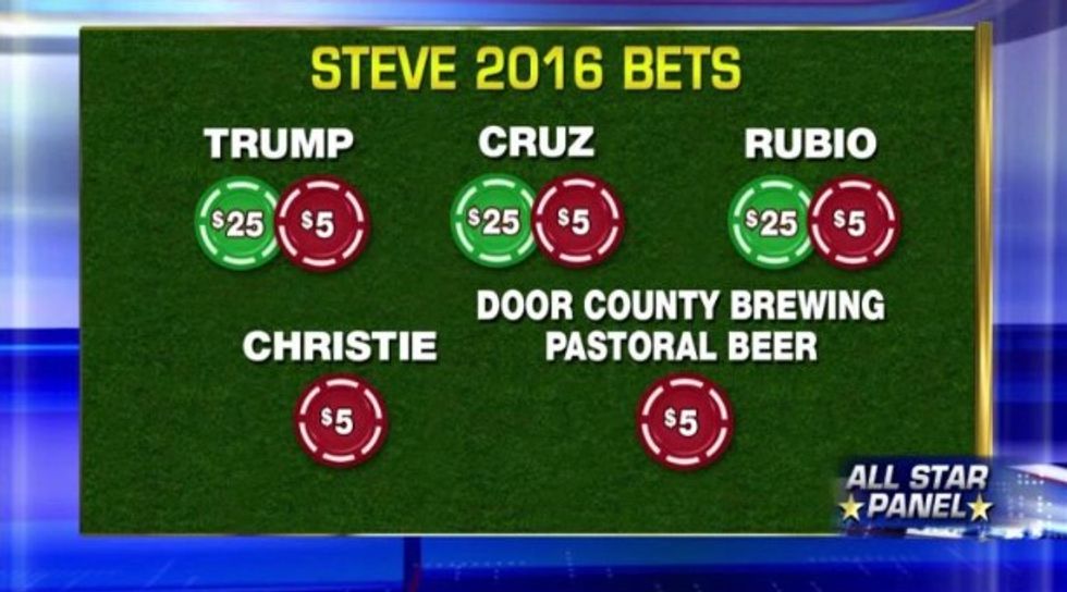 Hayes argued that it was a three-way tie for the nomination, placing $30 bets on Trump, Cruz and Rubio. He also placed a $5 bet on N.J. Gov. Chris Christie.