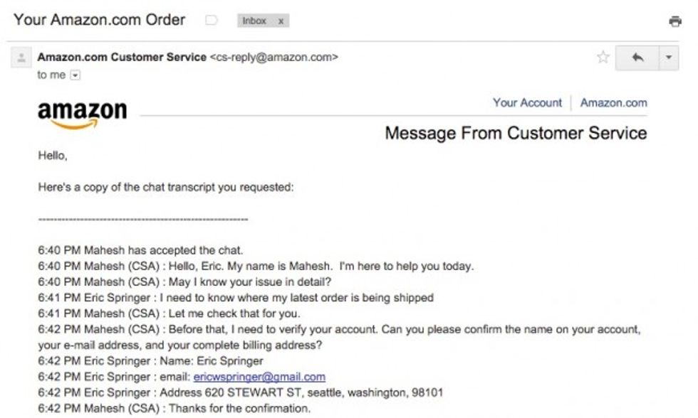 Over the weekend, Amazon customer Eric Springer shared his horrifying tale on Medium. Springer revealed that all a hacker needs to steal your account information is your name, email address and a mailing address--and not necessarily a correct mailing address. And it’s all thanks to the friendly individuals in customer service.