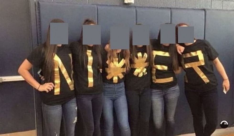 As for the Desert Vista High School girls whose shirts spelled out the N-word in the photo, a Tempe Unified High School District official told KPNX-TV that the six students have been suspended for 10 days — five days for use of a racial slur and five more days for endangering the school community.