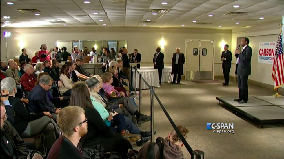 Republican presidential candidate Ben Carson fields a question from atheist Iowa voter about his faith Friday, Jan. 29. (Image source: C-SPAN/Twitter)