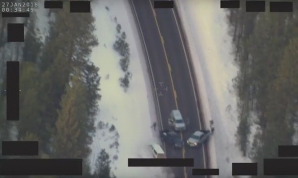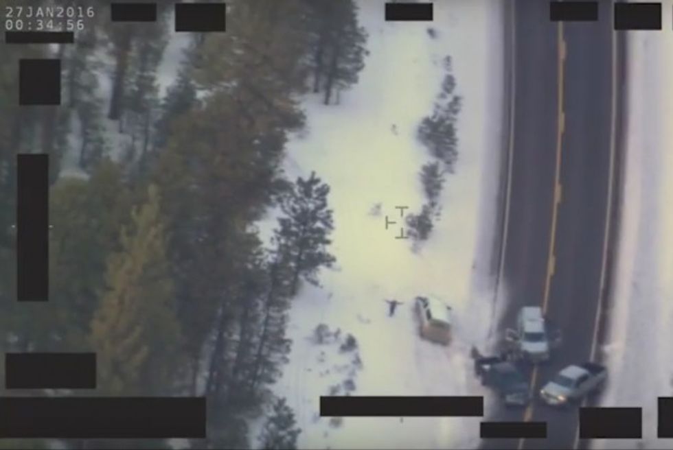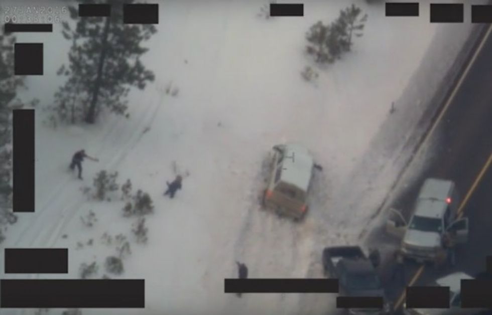 The video, shot by the FBI from aircraft, shows Bundy's vehicle stopped by police on a road. He and an occupier riding with him — Brian Cavalier — were arrested. A white truck driven by Finicum was stopped but took off, with officers in pursuit. The video shows Finicum's vehicle plowing into a snowbank when encountering a roadblock.