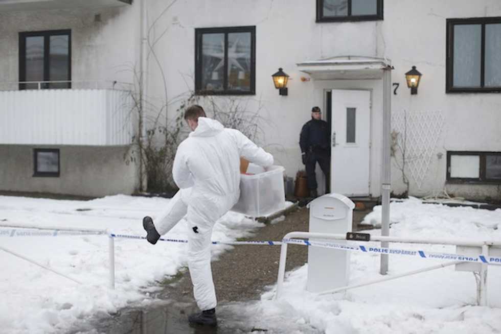 A forensic police officer carries a box of evidence following a search in front of a migrant center in Molndal outside Goteborg, Sweden, Jan. 25. A female employee was killed in a knife attack inside the center. (Adam Ihse/AP Photo)