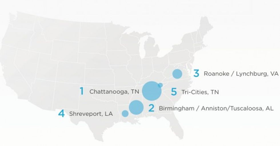 The most Bible-minded cities in 2015 were (from most to least): Birmingham/Anniston/Tuscaloosa, Alabama, Roanoke/Lynchburg, Virginia, Shreveport, Lousiana, and Tri-Cities, Tennessee.