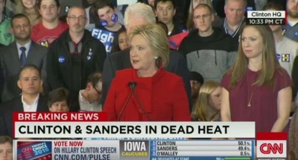 As former Secretary of State Hillary Clinton delivered her victory speech Monday night following the Iowa caucuses, an 18-year-old Drake University student whose face was adorned with Clinton stickers became the focus of attention.