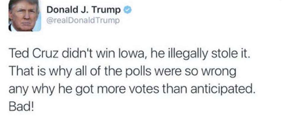 "Ted Cruz didn't win Iowa, he stole it. That is why all of the polls were so wrong and why he got far more votes than anticipated," Trump tweeted.