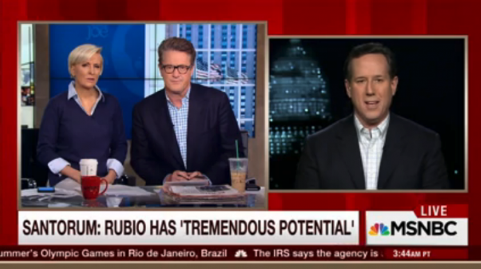 When asked by hosts Joe Scarborough and Mika Brzezinski why he decided to support Rubio over Texas Sen. Ted Cruz, Donald Trump or any of the remaining GOP candidates, Santorum said he chose Rubio because he is someone "who can work together with people."
