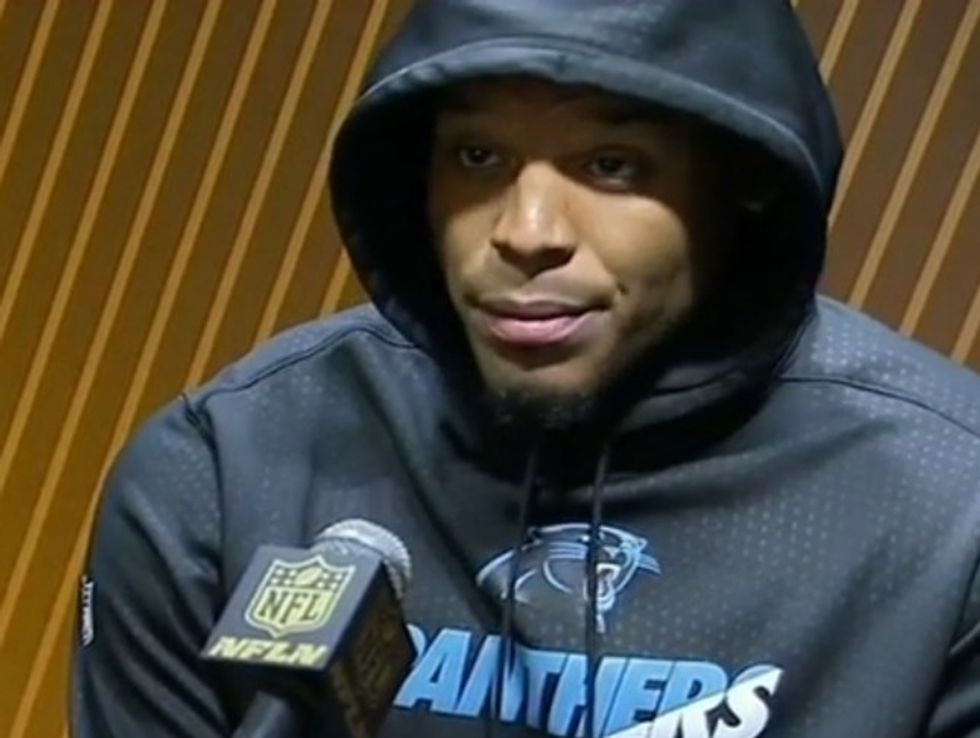 After losing the Super Bowl 24-10 Sunday, Newton sat in a press conference wearing a hood over his head and looking terribly dejected — and answering questions from the media probably was the last thing he wanted to do.