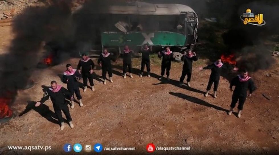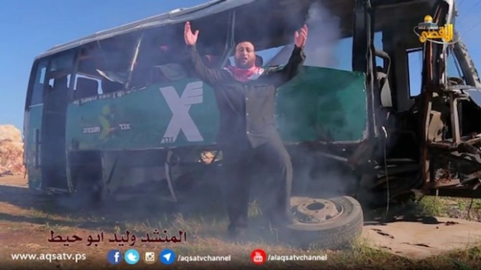 "The intifada is not an intifada if the bus roof doesn’t fly off," sang the men. (Image source: Al-Aqsa TV video)\n