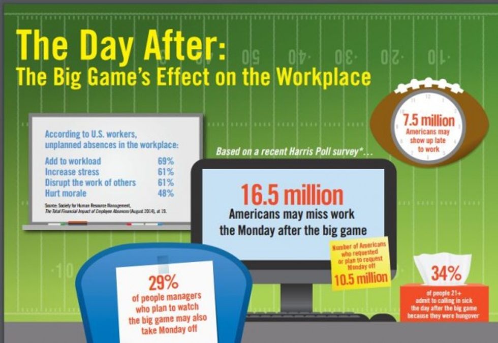 In addition to the 16.5 million who planned to take a sick day, the survey found that nearly 10.5 million Americans already scheduled Monday as a vacation day. The study also found that approximately 7.5 million Americans would show up late to work the day following the big game.