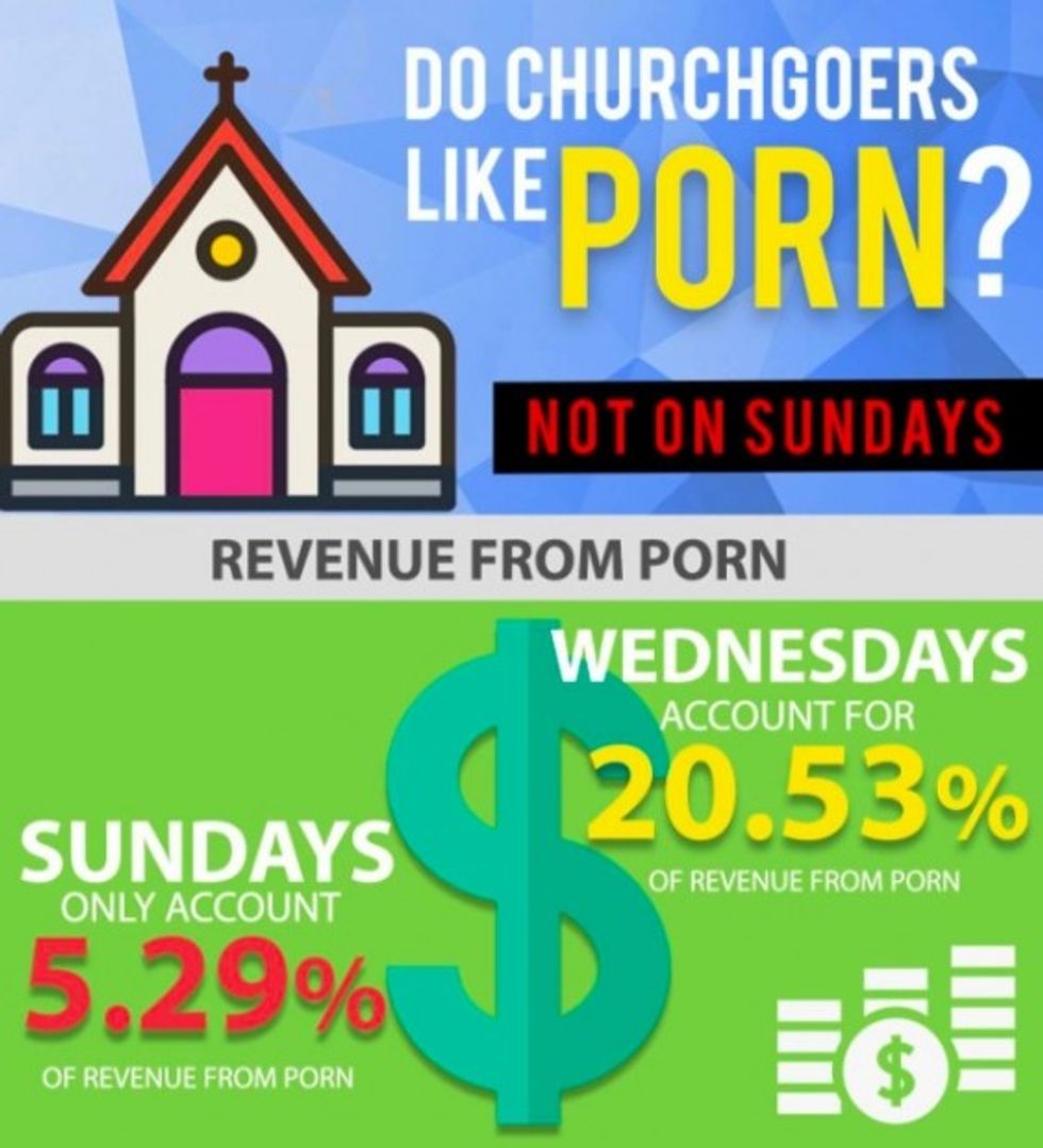 "Used to be, Sundays were the biggest days for online porn consumption, but new statistics show this is no longer the case," Gross recently wrote on his website, describing usage statistics that came from two specific porn sites, including Adult Empire. "But now the question becomes: are churchgoers using porn less or are they just changing their habits?"