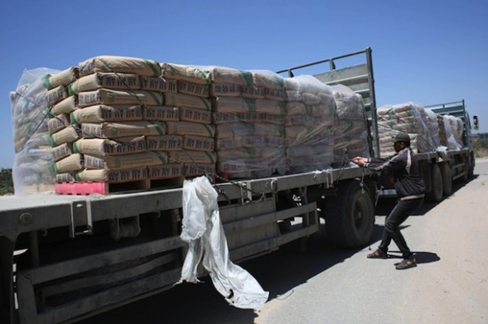 A Palestinian worker adjusts bags of cement loaded onto a truck after it entered the southern Gaza Strip from Israel through the Kerem Shalom crossing in Rafah on April 29, 2015. (Said Khatib/AFP/Getty Images)