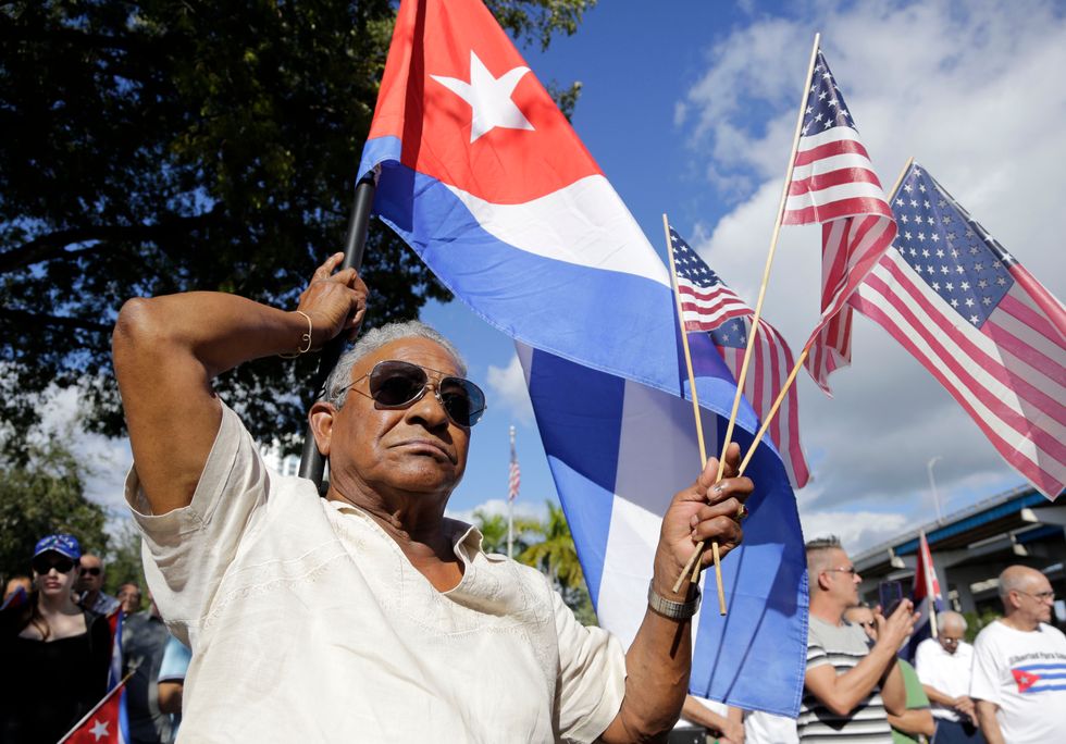 Evilio Ordonez holds Cuban and American flags during a protest against President Barack Obama's plan to normalize relations with Cuba, Saturday, Dec, 20, 2014, in the Little Havana neighborhood of Miami. (AP Photo/Lynne Sladky)