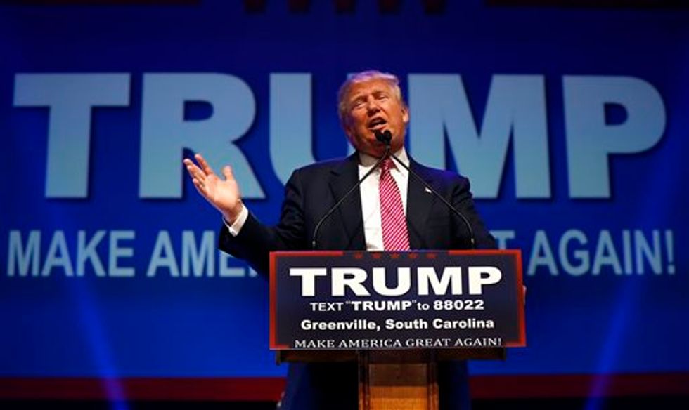 Republican presidential candidate Donald Trump speaks during a campaign stop, Monday, Feb. 15, 2016, in Greenville, S.C. (AP Photo/Paul Sancya)
