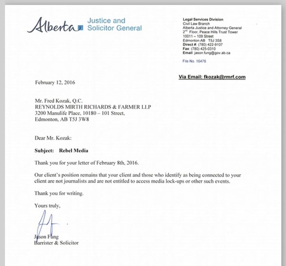 “Our client’s position remains that your client and those who identify as being connected to your client are not journalists and are not entitled to access media lock-ups or other such events,” read the one-line response to The Rebel from Justice Department lawyer Jason Fung.