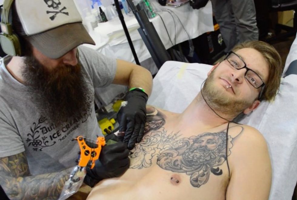In the case of the man in the photo below, the chest tattoo he was receiving would ultimately require between four and six hours of time to complete. And according to more than one "inked" person we spoke with, chest tattoos are some of the most painful to get.