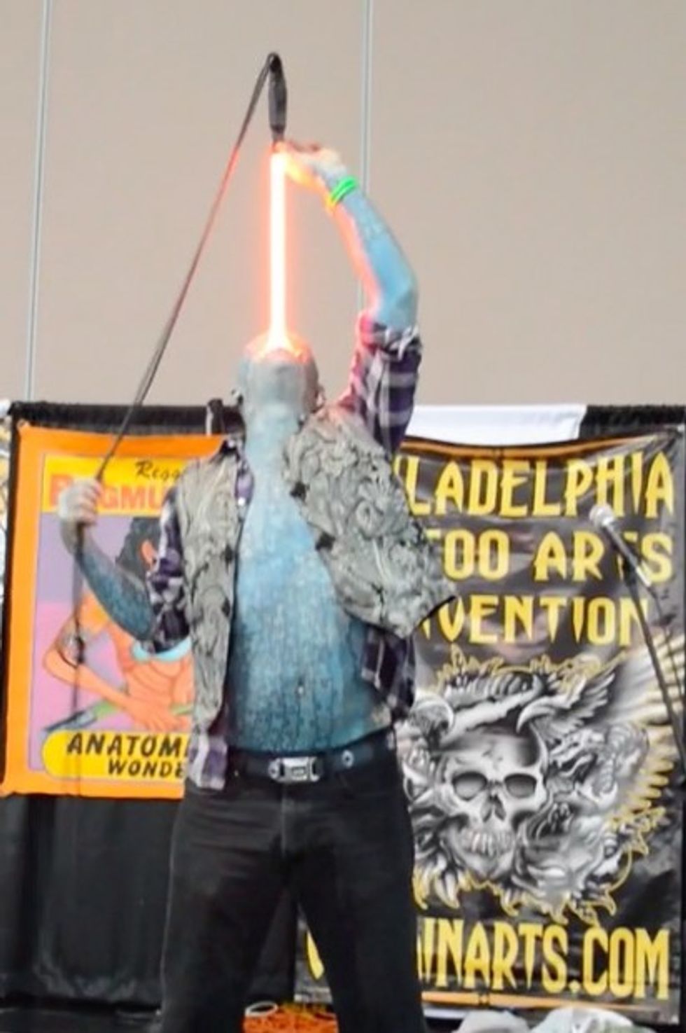 At one point, he performed the classic sword-swallowing trick, using a florescent light, light saber. And nobody got hurt.