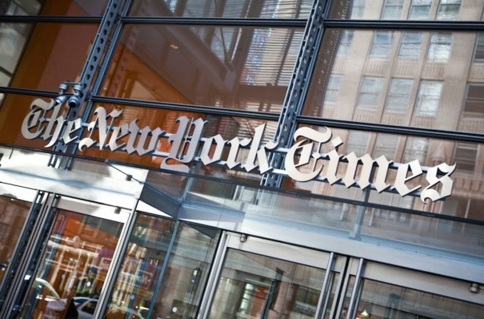 NEW YORK - APRIL 21: The New York Times logo is seen on the headquarters building on April 21, 2011 in New York City. (Photo by Ramin Talaie/Getty Images)