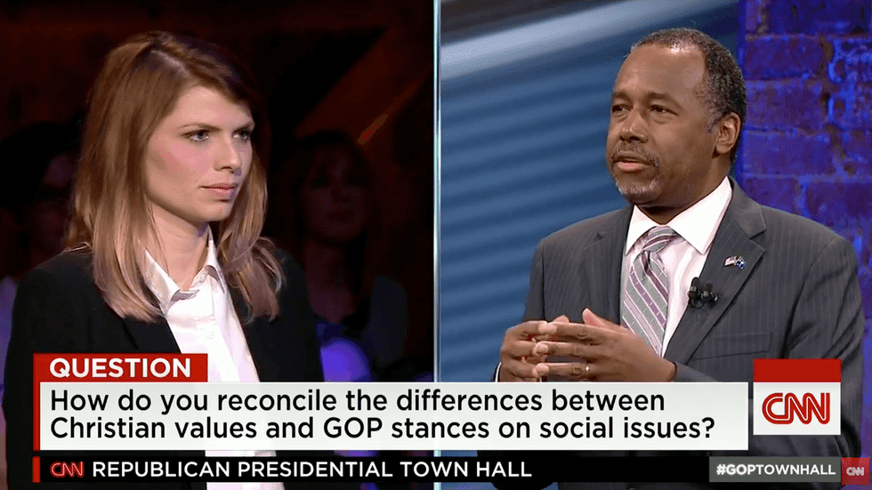 "Dr. Carson, how do you reconcile the differences between tradition Christian values, specifically caring for the least of these, and current GOP stances on issues such as welfare and subsidies for the poor?" Jessica Fuller asked the retired neurosurgeon.