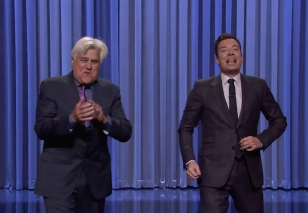 Leno deftly weaved from politics to climate change and was eventually joined by Fallon for a round of "How hot is it?" global warming jokes.