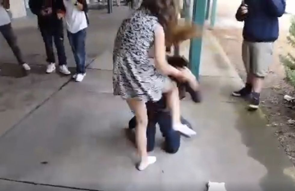 The clip, captured in front of a crowd of hollering students, showed the girl taking the boy to the ground in front of a classroom, kneeing him twice in the face and smashing her body into his.
