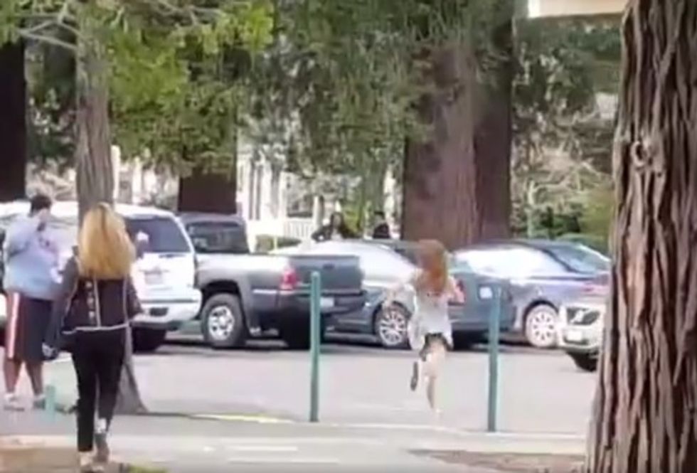 Just as the girl got up and ran away, a woman — presumably a teacher — yelled "Get that girl! Right now! Who is that girl? Get her!" and ran after her. The crowd's loudest hollering took place after the girl got away.
