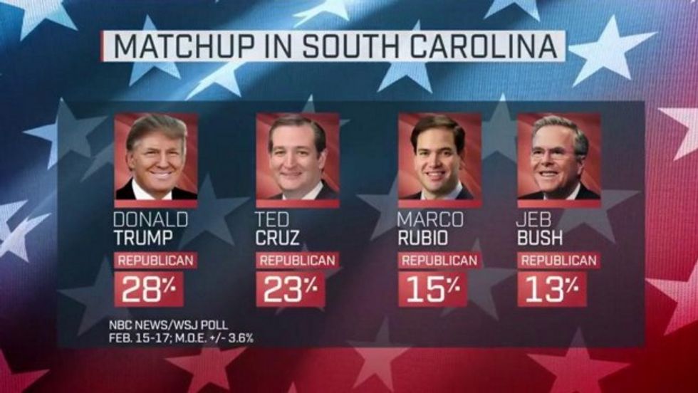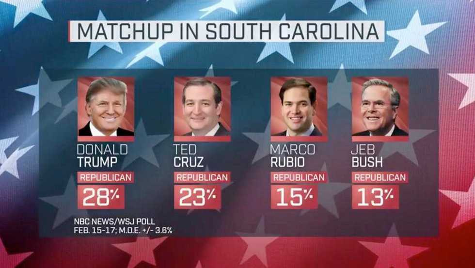 Florida Sen. Marco Rubio placed third in the poll with 15 percent of support. Former Florida Gov. Jeb Bush, who needs a strong showing in South Carolina, received 13 percent. Ohio Gov. John Kasich and retired neurosurgeon Ben Carson tied for fifth-place, each receiving 9 percent.