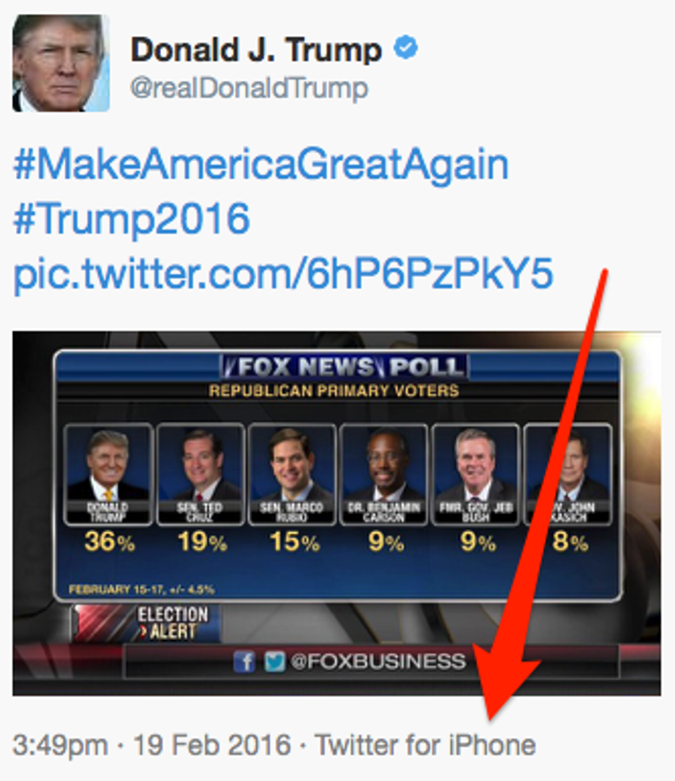 The Republican presidential candidate's latest tweet, in which he shares a screenshot showing him in first place in a South Carolina poll, also shows that Trump issued the tweet with his iPhone.
