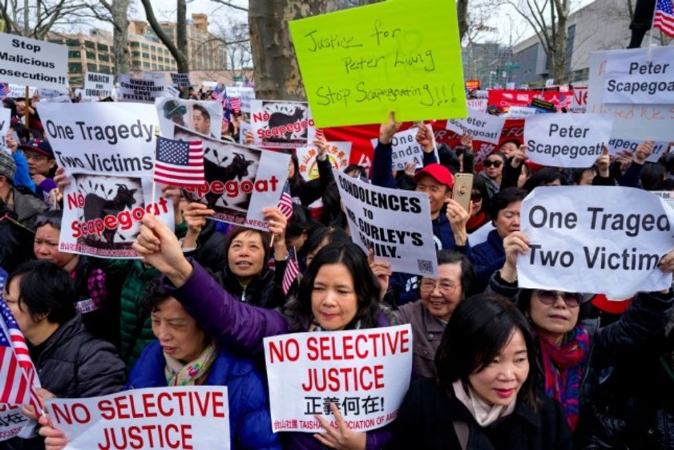 "No scapegoat! No scapegoat!" protesters in New York shouted as the crowd descended on Cadman Plaza, just outside the federal courthouse in Brooklyn. They carried signs reading "No Selective Justice" regarding Liang's prosecution.