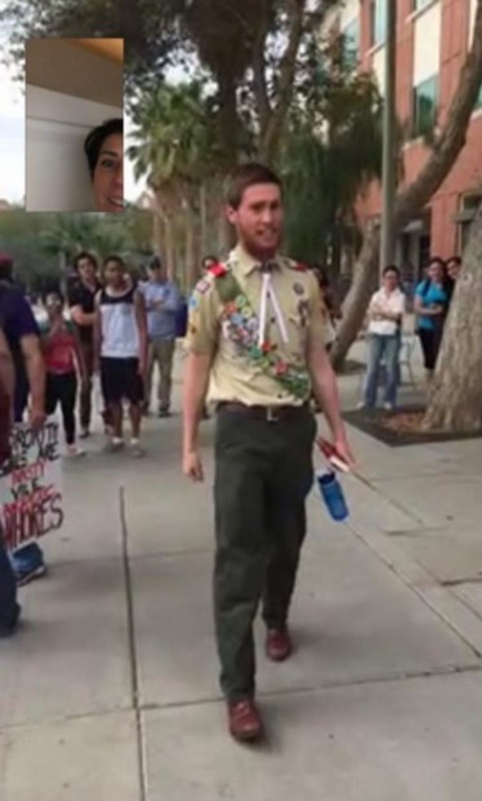“Walking to class with two of my friends and a grown man dressed as a boy scout yells, 'close your legs and stop dressing like a whore' (I'm in leggings and a big t-shirt) he then proceeded to tell us we are poisoning the world and murdering children," Cummings’ Facebook post read.