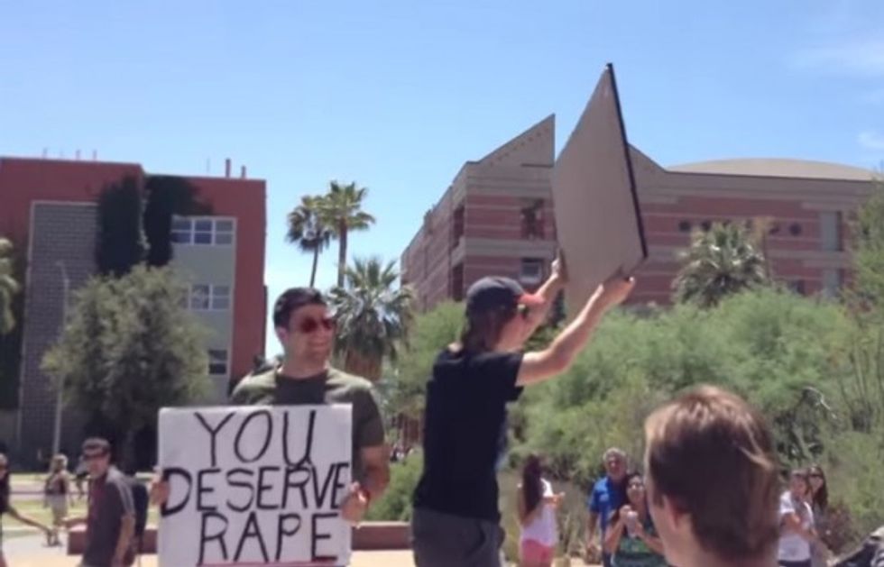 Dean "Brother Dean" Saxton stood on University of Arizona's campus in April 2013 holding a "You Deserve Rape" sign similar to the one used in Thursday's spectacle. (Image source: YouTube/JSXS)